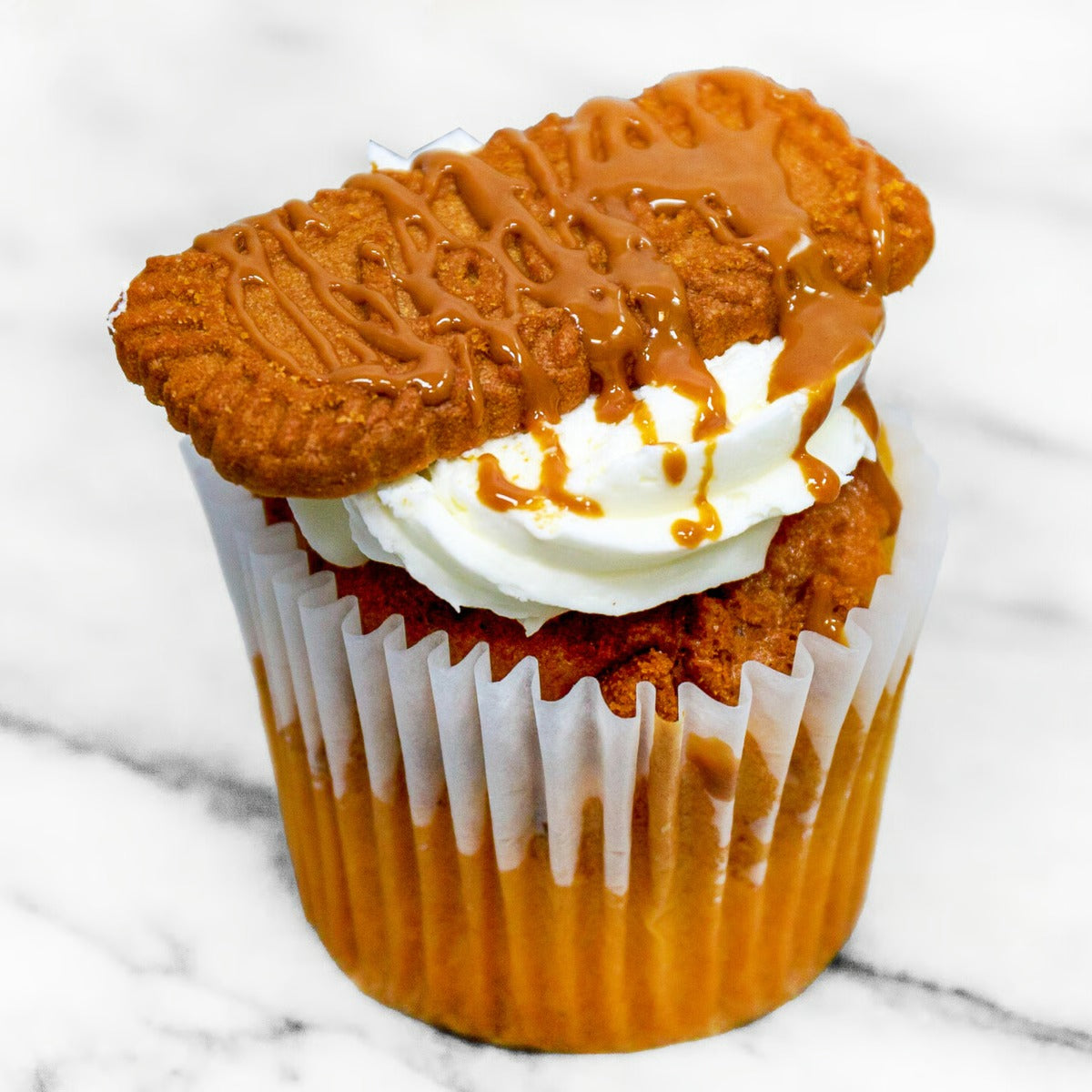 A soft, fluffy vanilla cupcake with a rich Biscoff spread topped with smooth American buttercream and finished with biscoff drizzle of caramelized cookie spread and a crunchy Biscoff biscuit. Sweet, spiced, and irresistibly indulgent.